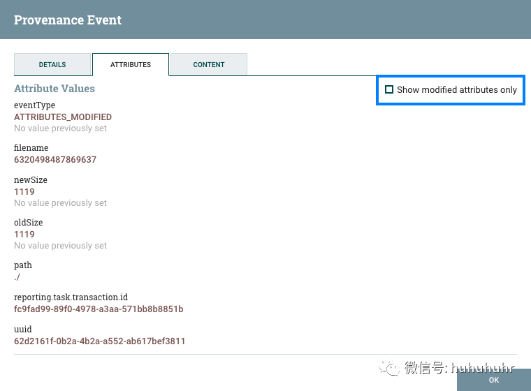 在这里,我们可以看到事件发生时FlowFile上存在的所有属性,以及这些属性的先前值。我们可以知道哪些属性因此事件而发生变化以及它们如何变化。此外,在右侧角是一个复选框,允许用户仅查看那些已更改的属性。如果FlowFile只有少量属性,这可能不是特别有用,但当FlowFile有数百个属性时,它可能非常有用。