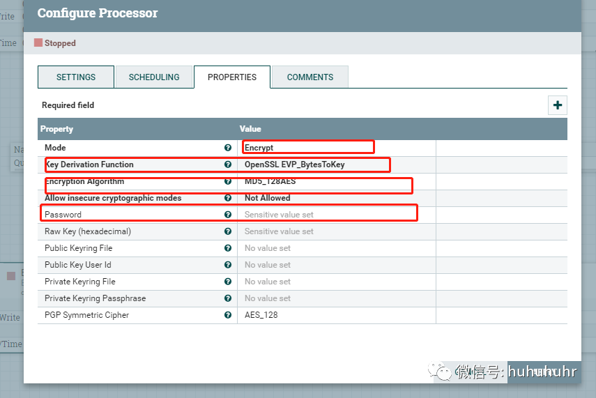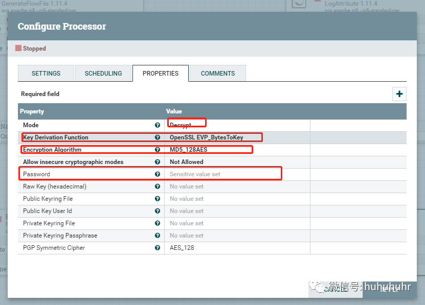 算法配置Encryption Algorithm:MD5系列和SHA系列 。Password一定要配置,并且密码字符串长度要大于10;Key Derivation Function需要配置NiFi Legacy KDF或者OpenSSL EVP_BytesToKey ;