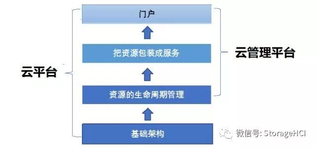 以上四层共同组成了云计算平台。其中,除了最底层的基础架构之外,上面的三层统称为云管平台。