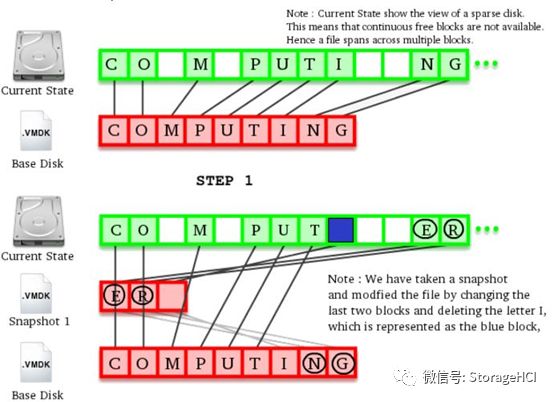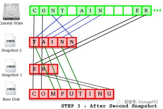 图中绿色部分是从虚拟机角度看数据;中间的红框是delta vmdk中的数据;最下面的红框是base vmdk中的数据。