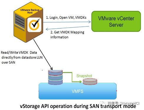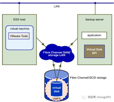 备份程序需要运行在物理服务器之内,该服务器必须能够通过SAN网络访问到VMFS LUN。