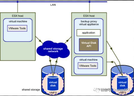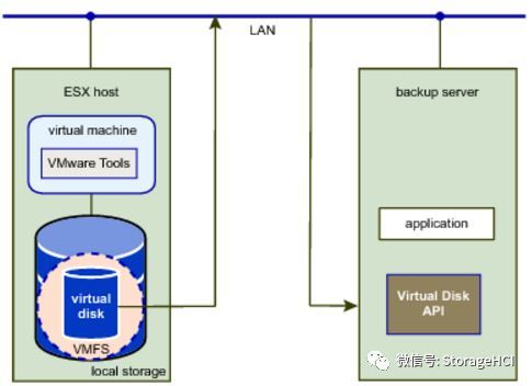 当备份存储运行在虚机之内时,可以利用 ESXi 的 SCSI HotAdd 特性来将虚拟磁盘直接挂在到该虚机上成为其一个本地磁盘。