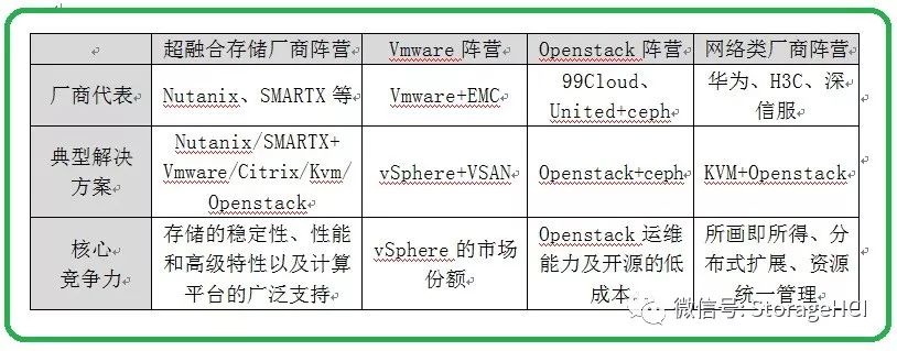 目前“超融合”生态圈四大阵营格局及解决方案特点如下表所示。