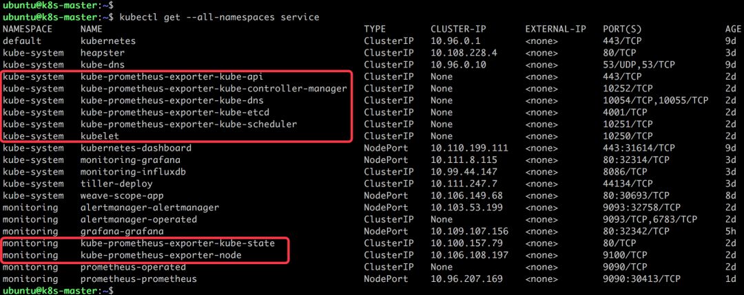 每个 Exporter 会对应一个 Service,为 Pormetheus 提供 Kubernetes 集群的各类监控数据。