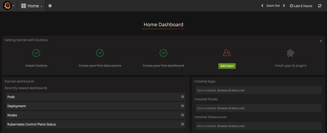 Grafana 的 DataSource 和 Dashboard 已自动配置。点击 Home