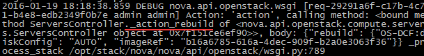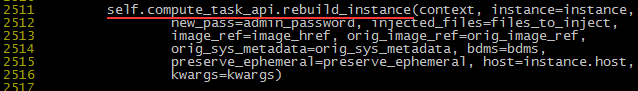 nova-api 向 Messaging(RabbitMQ)发送了一条消息:“Rebuild 这个 Instance”。源代码在 opt/stack/nova/nova/compute/api.py,方法是 rebuild。