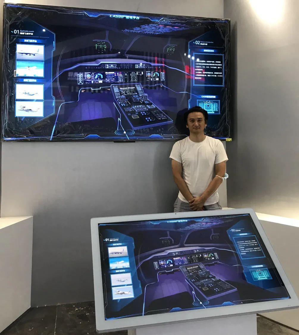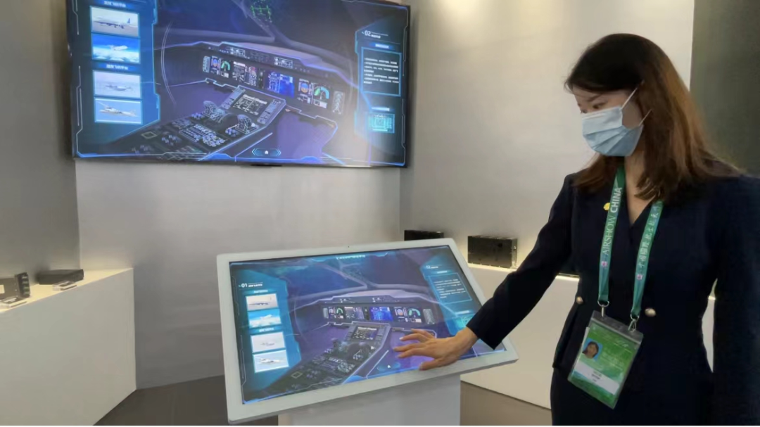 采用开放式、综合化座舱显示架构,支持多点触控操作,交互便捷,显示智能,研制保障等级 A 级:符合 A661 等标准规范,支持用户定制。高安全显示平台+应用驻留功能。具备平视显示,增强视景、合成视景功能、支持低能见度起降。15.4AMLCD 触摸交互大屏,提升操作体验。通过点击座舱内弹窗视频,在视频中将触控屏的特征、电子地图导航等信息进行展示。