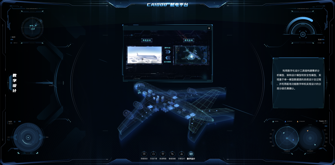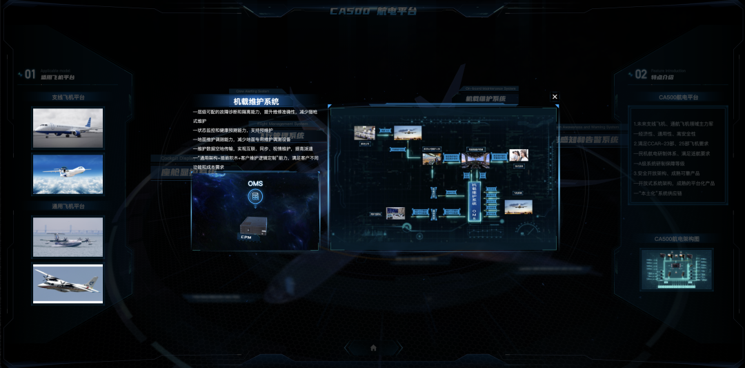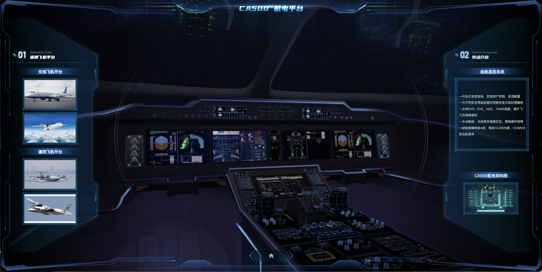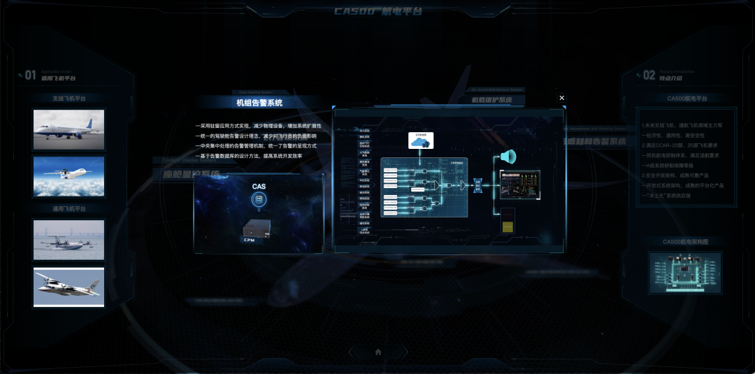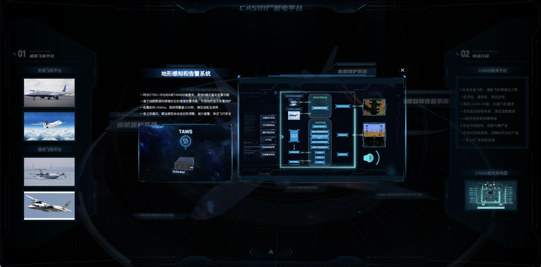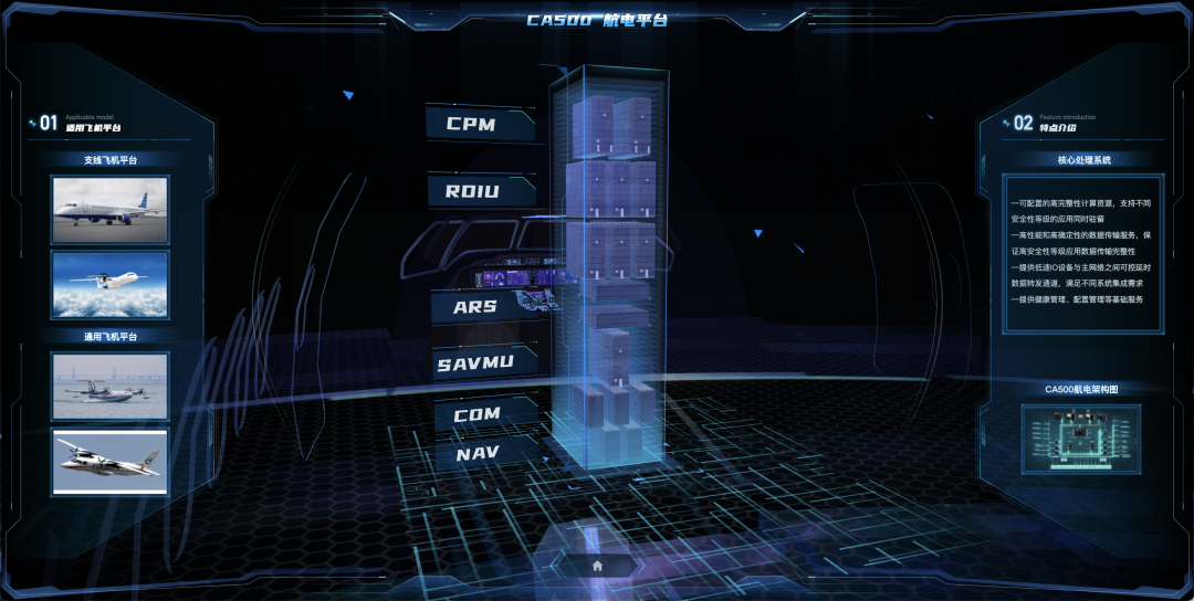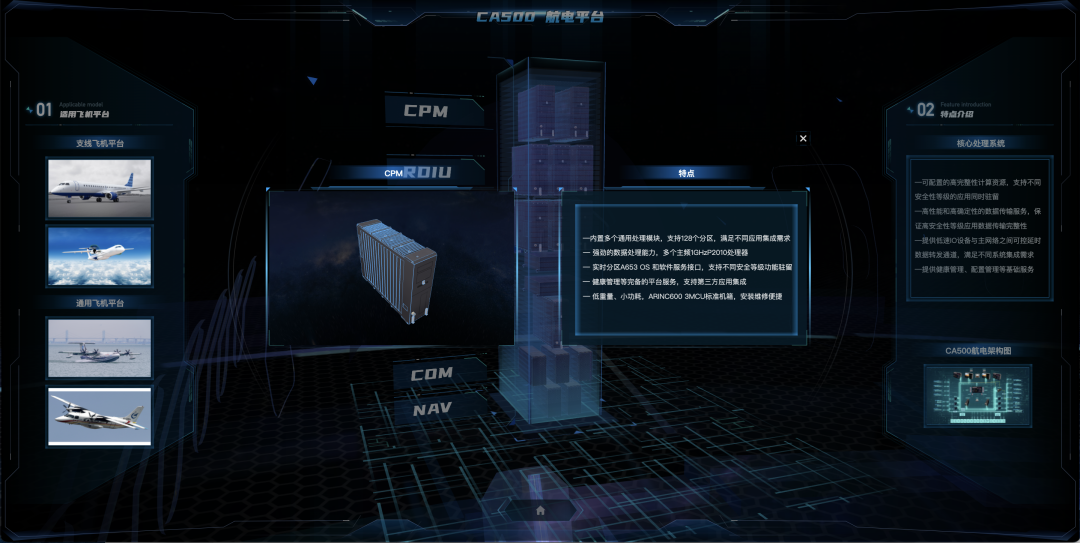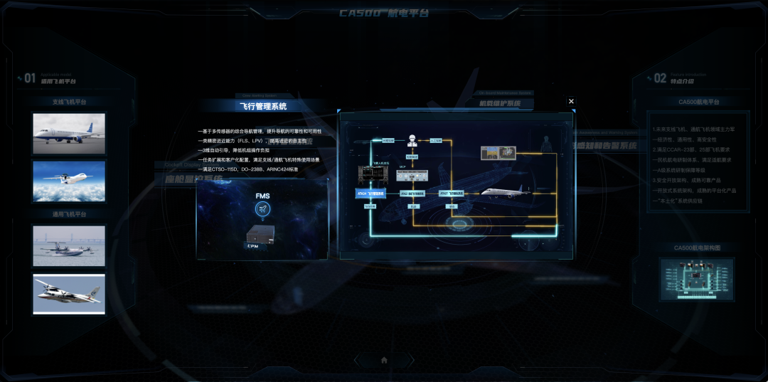 以交互式数字虚拟系统和静态实物结合形态为载体,通过陈列支线/通用飞机航电平台核心设备,以及航电平台关键系统/设备的数字化交互式体验呈现,着重展示支线/通用飞机航电平台航电系统综合能力、航电设备研制能力,应用开发能力以及为用户\OEM 等带来的收益。该平台拥有经济性高、功能先进、可靠性高、低重低功耗、便于维护的特点,可广泛适用于涡桨支线飞机、喷气式支线飞机、高端公务机、通航飞机等飞机平台,满足CCAR-25,CCAR-23 适航要求,具有完备的航线运营支持能力和任务扩展能力。