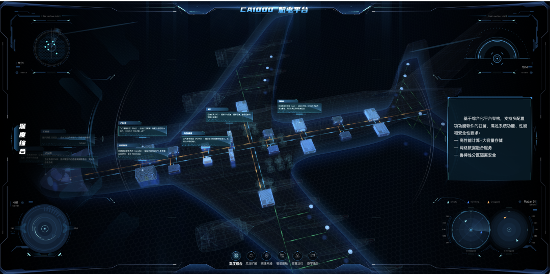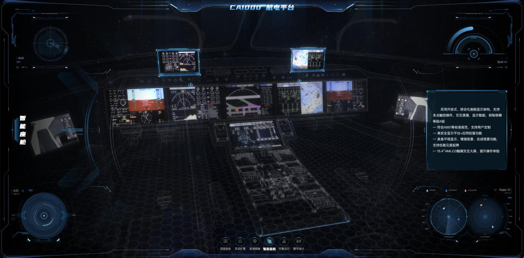 CA1000 航电支持全球跨地域飞行任务,具备高安全性,高派遣率,深度综合特点的航电系统平台。平台服务于单通道、双通道干线飞机,具有更高的数据融合和信息综合能力,全机网络和资源可配置技术,给了用户更多支持设备快速接入和更多应用驻留的选择,PBN、场面引导、4DT 协同、空域监视等高性能空管运行功能,保障用户高安全性和长航时飞行。