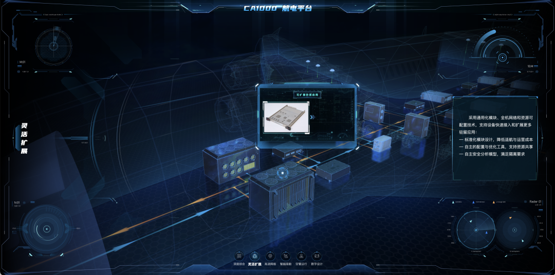 采用通用化模块,全机网络和资源可配置技术,支持设备快速接入和拓展更多可驻留应用。标准化模块设计,降低适航与运营成本、自主的配置与优化工具,支持资源共享、自主安全分析模型,满足隔离要求。