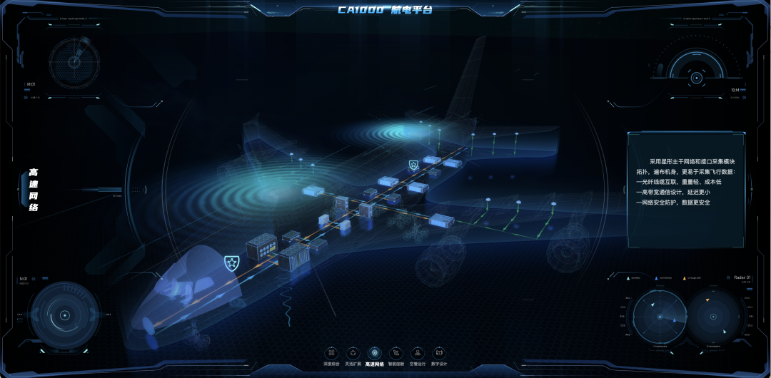 采用星形主干网络和接口采集模块拓扑,遍布机身,更易于采集飞行数据:光纤数缆互联,重量轻,成本低,高带宽通信设计,延迟更小。网络安全防护,数据更安全。