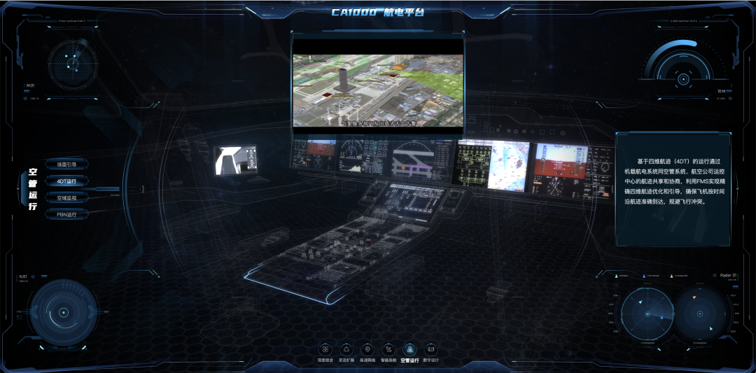 座舱内把航空电子系统的显示和控制按功能综合而成的人机交互系统。基于自主研发的 HT 图形引擎,打造机舱内仿真的效果,构建实时数据驱动的运行状态和航电设备模型,为数字孪生航电平台管理系统如高度控制板(BCP)、多功能键盘(MKB)、光标控制设备(CCD)、发动机指示控制板(ECP)、综合显示组件(IDU)等设备提供丰富的可视化展示形式和效果。