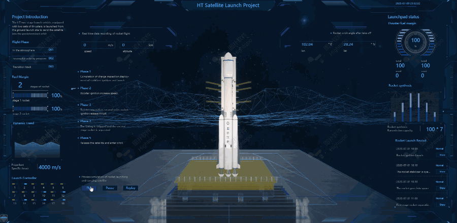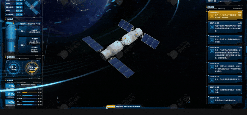 采用 Hightopo 的产品 HT 搭建 “天舟一号”货运飞船数字孪生管理系统。HT 三维仿真技术可多维度直观展示飞船主体、运载信息、飞行试验、技术实验、运行历程等重点管理对象的运行态势,支持全范围空间的态势可视化监控。智慧航天是基于大数据、云计算、人工智能技术的应用平台,它的出现能更加迅速的从海量数据中提取出有效的信息,为智慧决策提供有力支持。