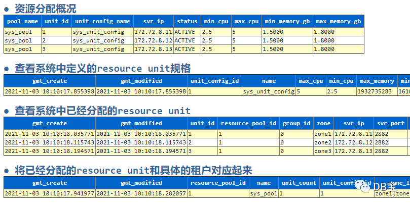 1C:\Users\lhrxxt>mysql -uroot@sys -plhr -h192.168.66.35 -P28814 2mysql: [Warning] Using a password on the command line interface can be insecure. 3Welcome to the MySQL monitor. Commands end with ; or \g. 4Your MySQL connection id is 92 5Server version: 5.6.25 OceanBase 3.1.1 (r4-8c615943cbd25a6f7b8bdfd8677a13a21709a05e) (Built Oct 21 2021 10:33:14) 6 7Copyright (c) 2000, 2020, Oracle and/or its affiliates. All rights reserved. 8 9Oracle is a registered trademark of Oracle Corporation and/or its10affiliates. Other names may be trademarks of their respective11owners.1213Type 'help;' or '\h' for help. Type '\c' to clear the current input statement.1415MySQL [(none)]> show databases;16+--------------------+17| Database |18+--------------------+19| oceanbase |20| information_schema |21| mysql |22| SYS |23| LBACSYS |24| ORAAUDITOR |25| test |26+--------------------+277 rows in set (0.64 sec)2829MySQL [(none)]> create database lhrdb;30Query OK, 1 row affected (0.62 sec)3132MySQL [(none)]> select * from oceanbase.__all_server;33+----------------------------+----------------------------+-------------+----------+----+-------+------------+-----------------+--------+-----------------------+------------------------------------------------------------------------+-----------+--------------------+--------------+----------------+-------------------+34| gmt_create | gmt_modified | svr_ip | svr_port | id | zone | inner_port | with_rootserver | status | block_migrate_in_time | build_version | stop_time | start_service_time | first_sessid | with_partition | last_offline_time |35+----------------------------+----------------------------+-------------+----------+----+-------+------------+-----------------+--------+-----------------------+------------------------------------------------------------------------+-----------+--------------------+--------------+----------------+-------------------+36| 2021-11-03 10:07:29.148223 | 2021-11-03 15:36:29.125523 | 172.72.8.11 | 2882 | 1 | zone1 | 2881 | 0 | active | 0 | 3.1.1_4-8c615943cbd25a6f7b8bdfd8677a13a21709a05e(Oct 21 2021 10:33:14) | 0 | 1635907362335045 | 0 | 1 | 0 |37| 2021-11-03 10:07:28.665950 | 2021-11-03 15:36:29.126133 | 172.72.8.12 | 2882 | 2 | zone2 | 2881 | 0 | active | 0 | 3.1.1_4-8c615943cbd25a6f7b8bdfd8677a13a21709a05e(Oct 21 2021 10:33:14) | 0 | 1635907363335302 | 0 | 1 | 0 |38| 2021-11-03 10:07:28.675445 | 2021-11-03 15:36:29.126735 | 172.72.8.13 | 2882 | 3 | zone3 | 2881 | 1 | active | 0 | 3.1.1_4-8c615943cbd25a6f7b8bdfd8677a13a21709a05e(Oct 21 2021 10:33:14) | 0 | 1635907362334795 | 0 | 1 | 0 |39+----------------------------+----------------------------+-------------+----------+----+-------+------------+-----------------+--------+-----------------------+------------------------------------------------------------------------+-----------+--------------------+--------------+----------------+-------------------+403 rows in set (0.12 sec)4142MySQL [(none)]> select43 -> zone,44 -> concat(svr_ip, ':', svr_port) as observer,45 -> concat(cpu_assigned, ' : ', cpu_total) as cpu_summary,46 -> concat(mem_assigned/(1024*1024*1024),' : ', mem_total/(1024*1024*1024)) as mem_summary_gb,47 -> concat(disk_assigned/(1024*1024*1024),' : ', disk_total/(1024*1024*1024)) as disk_summary_gb,48 -> cast(cpu_weight as decimal(5,2)) as c_weight,49 -> cast(memory_weight as decimal(5,2)) as m_weight,50 -> cast(disk_weight as decimal(5,2)) as d_weight,51 -> unit_num52 -> from oceanbase.__all_virtual_server_stat53 -> order by zone,observer;54+-------+------------------+-------------+-----------------+-----------------+----------+----------+----------+----------+55| zone | observer | cpu_summary | mem_summary_gb | disk_summary_gb | c_weight | m_weight | d_weight | unit_num |56+-------+------------------+-------------+-----------------+-----------------+----------+----------+----------+----------+57| zone1 | 172.72.8.11:2882 | 2.5 : 10 | 1.5000 : 6.0000 | 2.0000 : 2.0000 | 0.50 | 0.50 | 0.00 | 1 |58| zone2 | 172.72.8.12:2882 | 2.5 : 10 | 1.5000 : 6.0000 | 2.0000 : 2.0000 | 0.50 | 0.50 | 0.00 | 1 |59| zone3 | 172.72.8.13:2882 | 2.5 : 10 | 1.5000 : 6.0000 | 2.0000 : 2.0000 | 0.50 | 0.50 | 0.00 | 1 |60+-------+------------------+-------------+-----------------+-----------------+----------+----------+----------+----------+613 rows in set (0.40 sec)