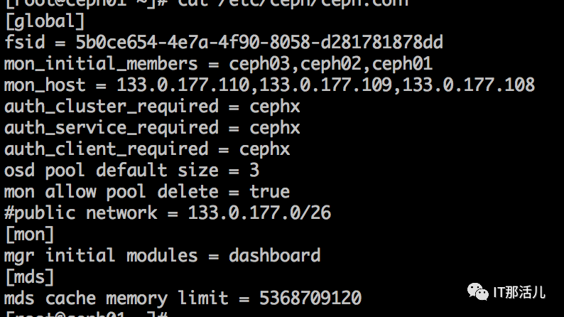 [global]fsid = 5b0ce654-4e7a-4f90-8058-d281781878ddmon_initial_members = ceph03,ceph02,ceph01mon_host = 133.xxx.xxx.110,133.xxx.xxx.109,133.xxx.xxx.108auth_cluster_required = cephxauth_service_required = cephxauth_client_required = cephxosd pool default size = 3