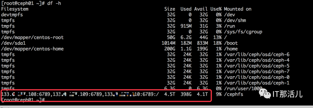 创建完成后,就可以在任意节点或客户端(linux7系统以上)使用mount命令来使用此cephfs了。命令如下: