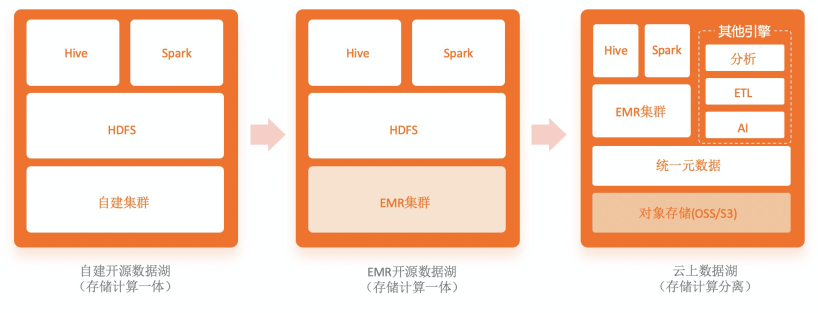 阶段二:云上托管Hadoop数据湖架构(即EMR开源数据湖),底层物理服务器和开源软件版本由云厂商提供和管理,数据仍统一存放在HDFS系统上,引擎以Hadoop和Spark开源生态为主。
