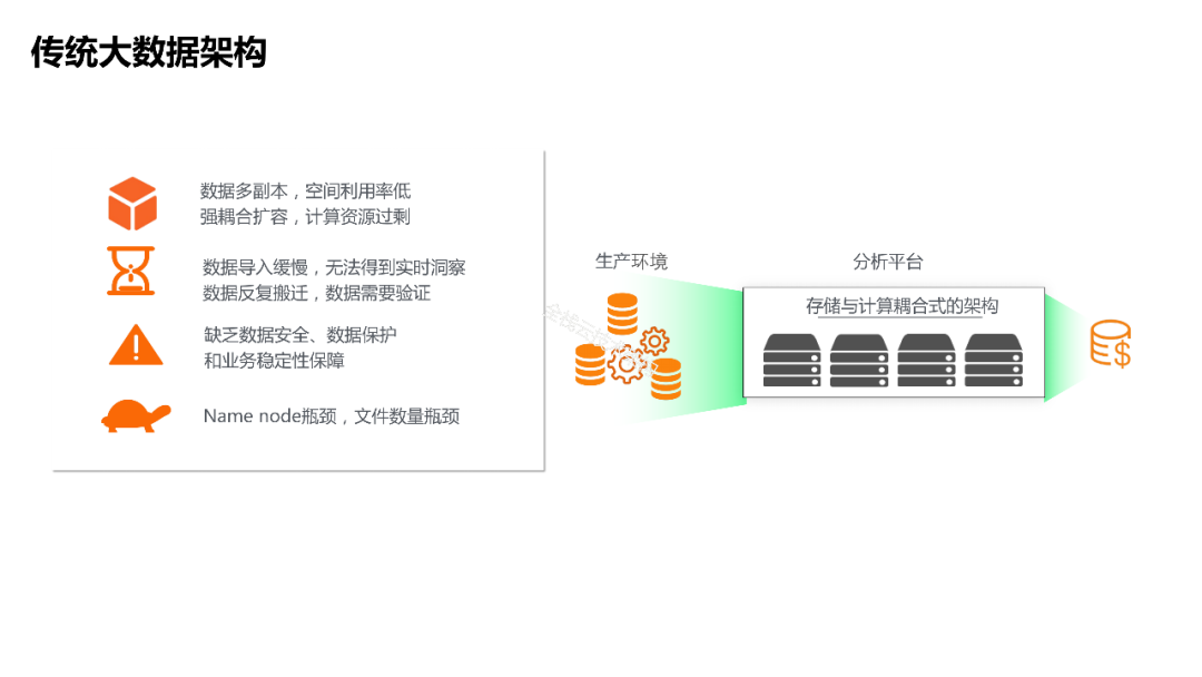 阶段一:自建开源Hadoop数据湖架构,原始数据统一存放在HDFS系统上,引擎以Hadoop和Spark开源生态为主,存储和计算一体。缺点是需要企业自己运维和管理整套集群,成本高且集群稳定性差。