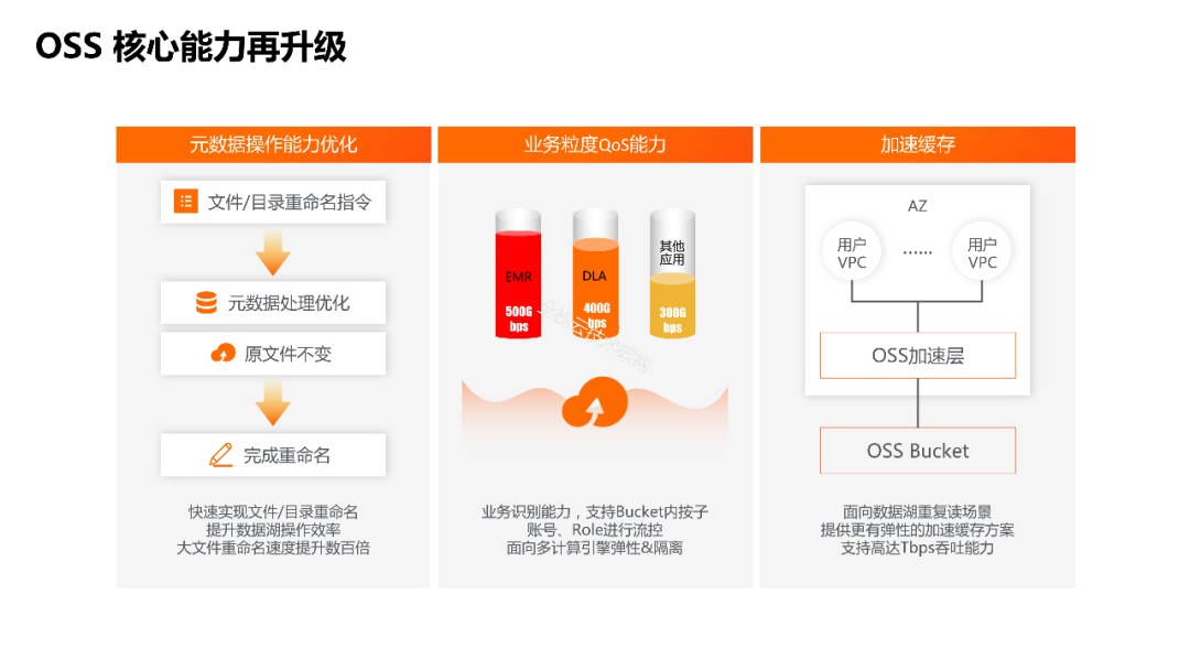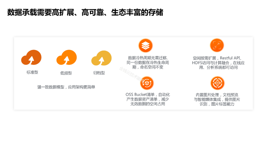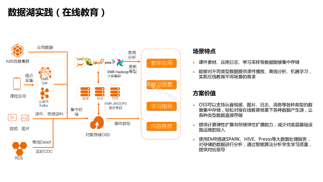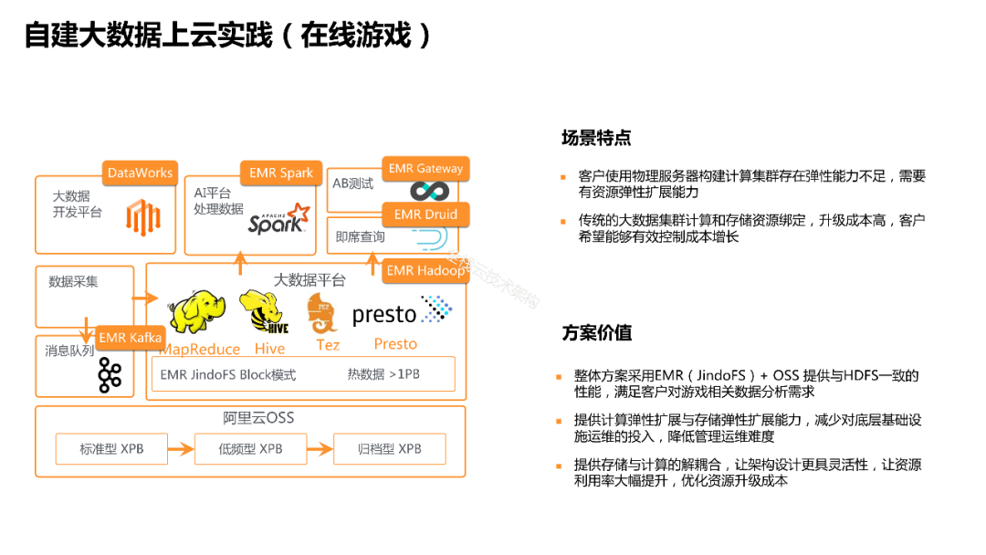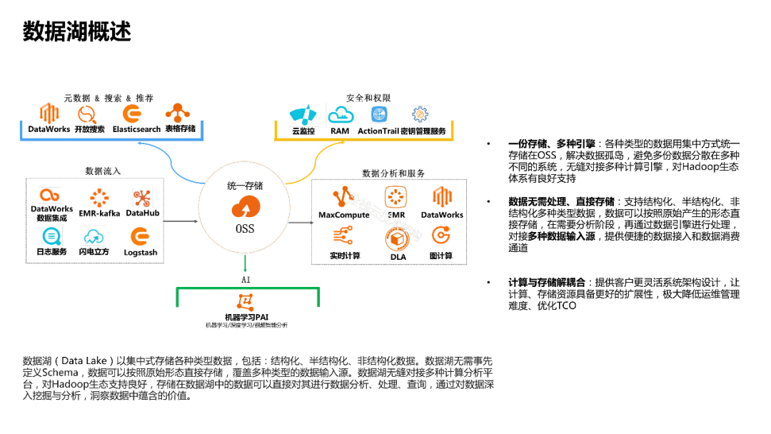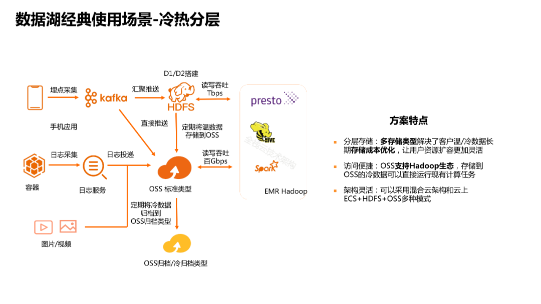 • 一份存储、多种引擎:各种类型的数据用集中方式统一存储在OSS,解决数据孤岛,避免多份数据分散在多种不同的系统,无缝对接多种计算引擎,对Hadoop生态体系有良好支持;