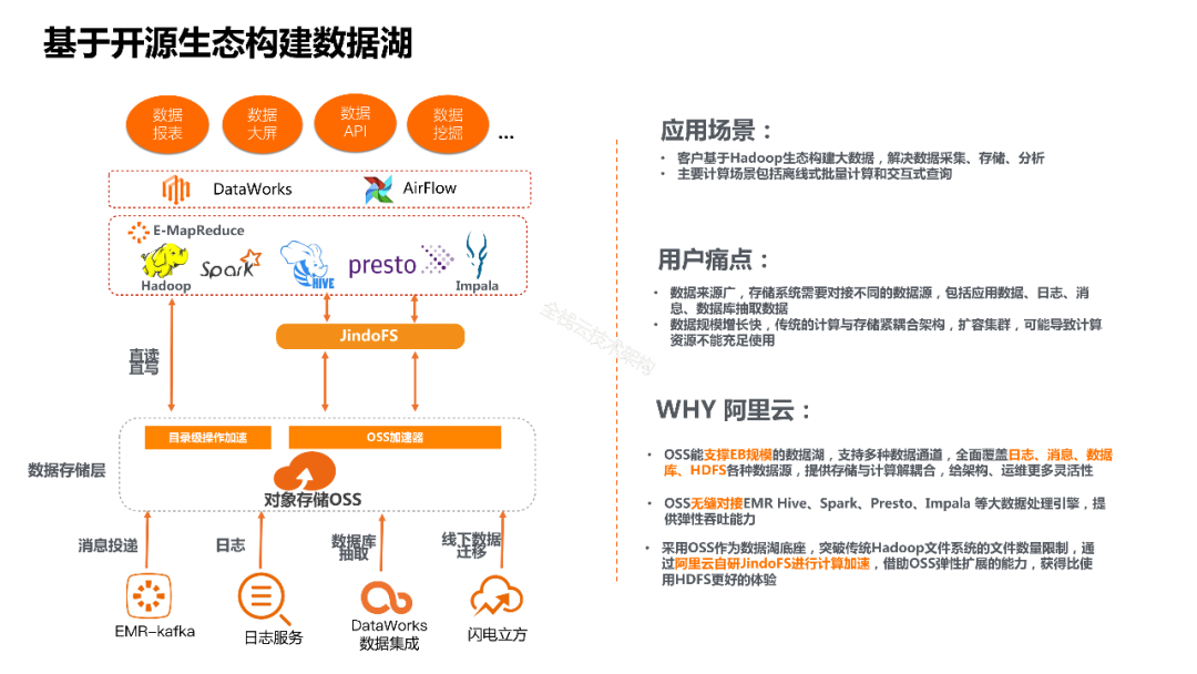下图是阿里云EMR数据湖架构图,它是基于开源生态的大数据平台,既支持HDFS的开源数据湖,也支持OSS的云上数据湖。