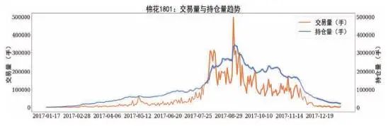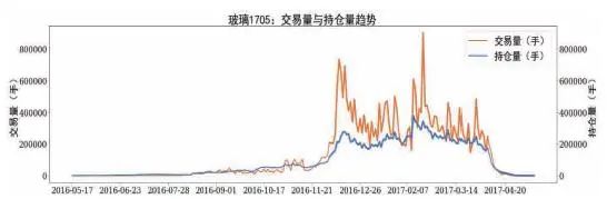 回溯历史数据,所有合约在挂牌摘牌整个周期中,都会经历交易持仓量逐渐放大随后下降的过程。其中,有较大比例的主力合约(接近40%)在挂牌摘牌的整个周期会呈现“双峰”现象。“双峰”现象即合约在成为主力之后,交易量与持仓量会经历两个峰值,其中交易量尤为明显。我们以图1、2分别展示玻璃期货1705与棉花期货1801两个合约的交易持仓走势。从图中可以看出,虽然玻璃、棉花分属于非农与农两个类别,但是交易量上都呈现出较为典型的双峰形态。该现象产生原因可能一是当合约成为主力合约之后,交易资金会快速流入,导致交易持仓量快速放大;二是前主力合约进入交割摘牌阶段,主力合约因此达到第二个高峰。双峰现象的周期性规律对于我们掌握品种运行规律及预测交易持仓起到指导性作用。