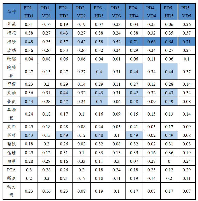表1中PD1-HD1表示当N值取1时,Pdelta与Hdelta之间的关联系数;PD1-VD1表示当N值取1时,Pdelta与Vdelta之间的关联系数,以此类推。从表中易知,在不同N的取值下,所有品种的相关系数均为正。因此,交易持仓量的变化与价格波动的绝对值之间确实存在着正向关系。但是,学术界一般认为,当相关系数|r|>0.8时,两变量间存在高度相关性;当0.6<|r|<0.8时,可以认为两变量具备较强相关性;当0.4<|r|<0.6时,两变量具备中等相关性;当0.2<|r|<0.4时,可认为两变量相关性较弱。从表中可发现,除少数蓝色区域(大于0.4),大多数品种交易持仓量的变化与价格波动幅度的关系均较弱,且间隔日期N的长短对于结论也无较明显影响。整体来看,价格波动对于交易量、持仓量趋势均有一定正向影响。在提取特征时,需要将价格波动相关数据引入模型,但需要设计模型结构捕捉非线性关系提高数据价值。