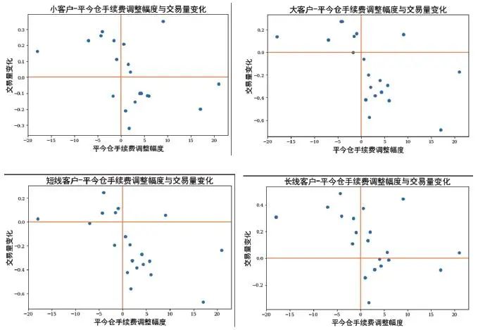 图4.不同客户群体下平今仓手续费调整幅度与调整点前后五日交易量均值变化关系