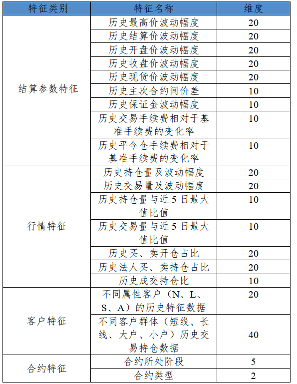 数值预测相关问题中,特征选择是模型构建的重要基础,决定了模型效果。本文经过数据分析及实验迭代,最终决定选择包含结算参数、行情特征、客户特征及合约特征等四大类共317维特征。其中,结算参数包含如历史价格波动、合约间价差等多维度特征;行情特征包含了历史交易持仓相关数据特征;客户特征包含不同属性客户的特征数据及不同客户群体的交易特征;合约特征重点提取了合约运行特征及合约阶段,约束预测结果。