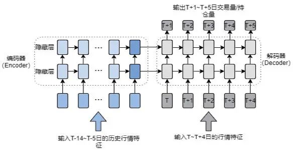 Seq2Seq模型,全称为Sequence to Sequence,是由谷歌大脑团队和Yoshua Bengio团队提出的一种广泛运用在翻译、文本自动摘要及一些回归预测问题上的深度神经网络。在提出之初,Seq2Seq主要被用来解决自然语言处理相关的问题。但因其强大的时序关系挖掘能力,近年来也被逐渐应用于数值型序列的预测问题中。如图所示,本文所用网络通过编码器(Encoder)与解码器(Decoder)两个过程将过往十日的行情特征作为输入序列,将其映射为未来五日的交易量或持仓量序列。编码器利用非线性函数将输入序列组合为隐藏层的隐藏向量,该向量具备表达输入序列信息及潜在关系的能力。解码器将传递来的隐藏向量进行解码,并结合输入的T~T+4日的市场行情特征,逐日预测未来T+1~T+5日的交易持仓情况。