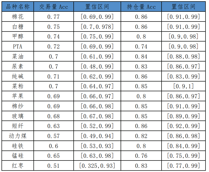 为多角度评估模型效果,本文在准确率之外引入了置信区间概念。计算每个品种预测准确率置信度为95%的区间范围,具体计算方式如下:Avg代表N个预测日的平均准确率,Delta代表N个预测日的标准差,定义95%置信区间为[Avg-delta*1.96, Avg+delta*1.96]。通常来说,置信区间的上下界代表了预测结果的可信度及波动性。上下界数值越高,差值越低表示预测效果更好。