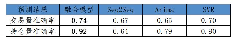 本文尝试基于历史数据特征的融合模型实现交易、持仓量的预测。整体来看,融合模型可以有效预测未来五日交易、持仓量。其中,持仓量准确率较高,交易量准确率与稳定性相对较差。作为探索性项目,本文仍存在以下不足。