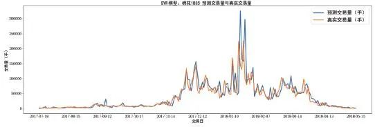 同时,本文仍以CF1805为例,运用图形化模式展示各模型T+1日交易量预测值与真实值走势,具体见图6、图7、图8及图9。从图中易知,融合模型拟合真实趋势的效果更好,Seq2Seq与Arima模型在部分时间段与真实趋势背离较大。SVR模型对于行情拟合较好,但缺点是极端行情下的偏离度太大。