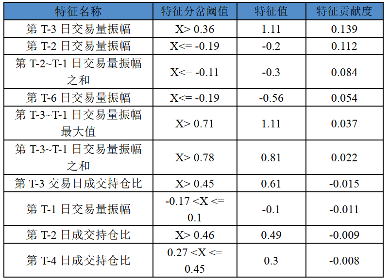 在时序数据预测的业务问题中,预测结果的可解释性是一个重点关注领域。针对融合模型,如何高效直观的解释预测结果成为一个挑战。本文使用LIME(Local Interpretable Model-agnostic Explanation)4 方法对预测结果进行解释,量化不同特征对于预测结果的贡献度。以CF1805在2018年1月11日的交易量预测为例,真实值为46484手,模型预测值为49865手。使用LIME方法解释该预测结果,按照倒序排列,挑选对于预测结果影响最大的十个特征,具体见表9。表中共四列,第一列为特征具体名称,第二列为根据LIME计算的特征分叉阈值,第三列为特征实际值,第四列为特征贡献度。其中,特征分叉阈值意味着当特征值超过阈值时,该特征将对于最终预测结果产生影响。一般来说,LIME方法中的特征贡献度主要应用于评估分类问题中各个特征对于预测结果的影响大小。而本文的实际问题归属于数值回归,特征贡献度仍然可以表征该特征对于最终结果的正负影响度。举例来说,特征贡献度绝对值最大的是“第T-3日交易量振幅”这个特征,该特征分叉阈值为0.36,而真实值为1.11,远高于阈值。因此这个特征被LIME判定为对于最终结果贡献系数为0.139,即该参数值对于模型最终结果贡献了13.9%的正向影响。同时,我们可观察到特征“第T-3交易日成交持仓比”贡献度为-0.015,即该特征大小对最终预测结果影响为负1.5%。