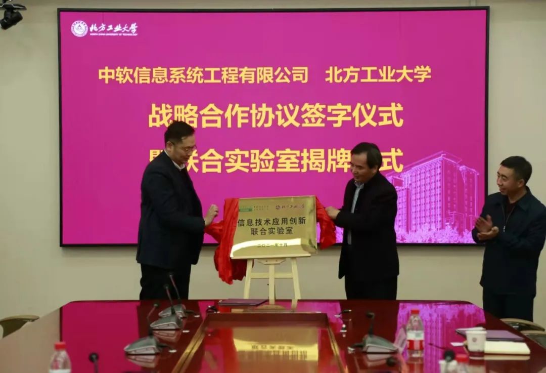 11月1日,中国软件旗下中软信息系统工程有限公司(以下简称中软系统)同北方工业大学举行战略合作协议签字仪式暨信息技术应用创新联合实验室揭牌仪式。中国软件高级副总经理吴晶、中软系统执行董事闫兴华,北方工业大学副校长王建稳、副校长栗苹出席签约仪式。