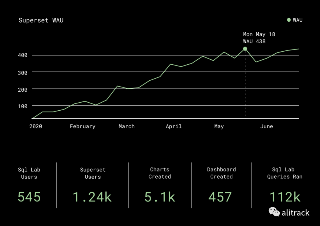 Superset 每周平均用户趋势(顶部)、总体用户和创建的内容(底部)