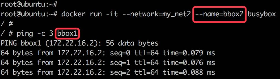 docker run -it --network=my_net2 --name=bbox2 busybox