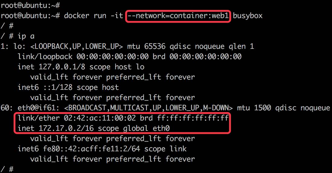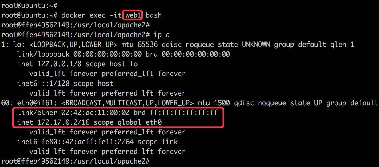 请注意 busybox 容器中的网络配置信息,下面我们查看一下 web1 的网络: