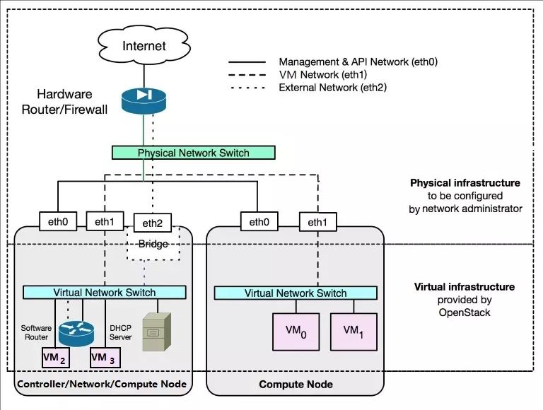 控制节点三个网卡(eth0, eth1, eth2),计算节点两网卡(eth0, eth1)。