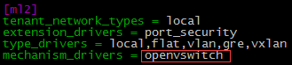 接下来就可以修改 ML2 的配置文件 etc/neutron/plugins/ml2/ml2_conf.ini,设置使用 openvswitch mechanism driver。