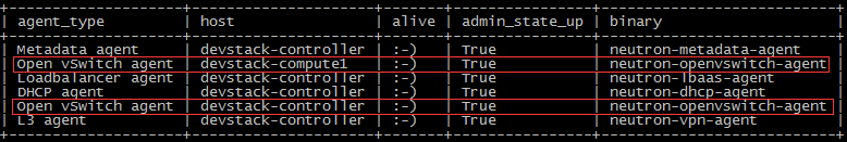 Neutron 服务重启后,可以通过 neutron agent-list 命令查看到 neutron-openvswitch-agent 已经在两个节点上运行。
