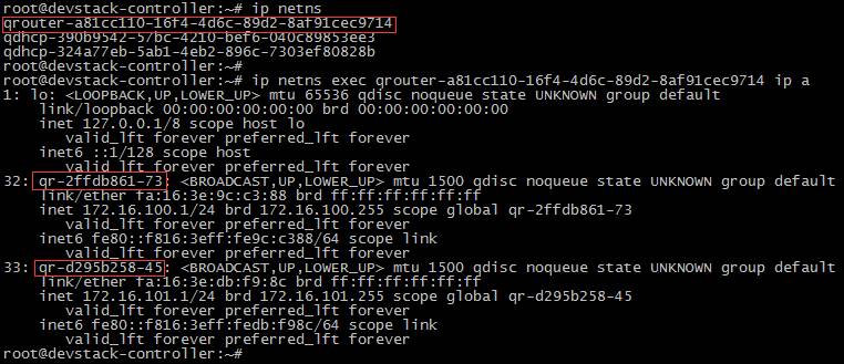 如上所示,qrouter-a81cc110-16f4-4d6c-89d2-8af91cec9714 为 router 的 namespace,两个 Gateway IP 分别配置在 qr-2ffdb861-73 和 qr-d295b258-45 上。