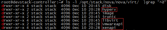 我们可以在 opt/stack/nova/nova/virt/ 目录下查看到 OpenStack 源代码中已经自带了上面这几个 Hypervisor 的 Driver