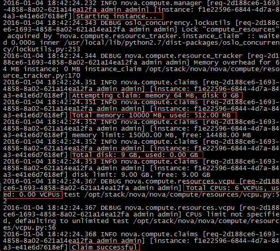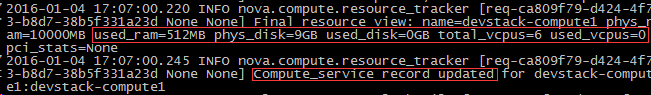 从 nova-compute 的日志 opt/stack/logs/n-cpu.log 可以发现: 每隔一段时间,nova-compute 就会报告当前计算节点的资源使用情况和 nova-compute 服务状态。