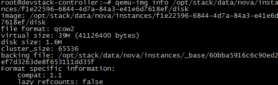 这里 instance 的镜像文件位于 opt/stack/data/nova/instances/f1e22596-6844-4d7a-84a3-e41e6d7618ef/disk,格式为 qcow2,其中 f1e22596-6844-4d7a-84a3-e41e6d7618ef 就是 instance 的 id。