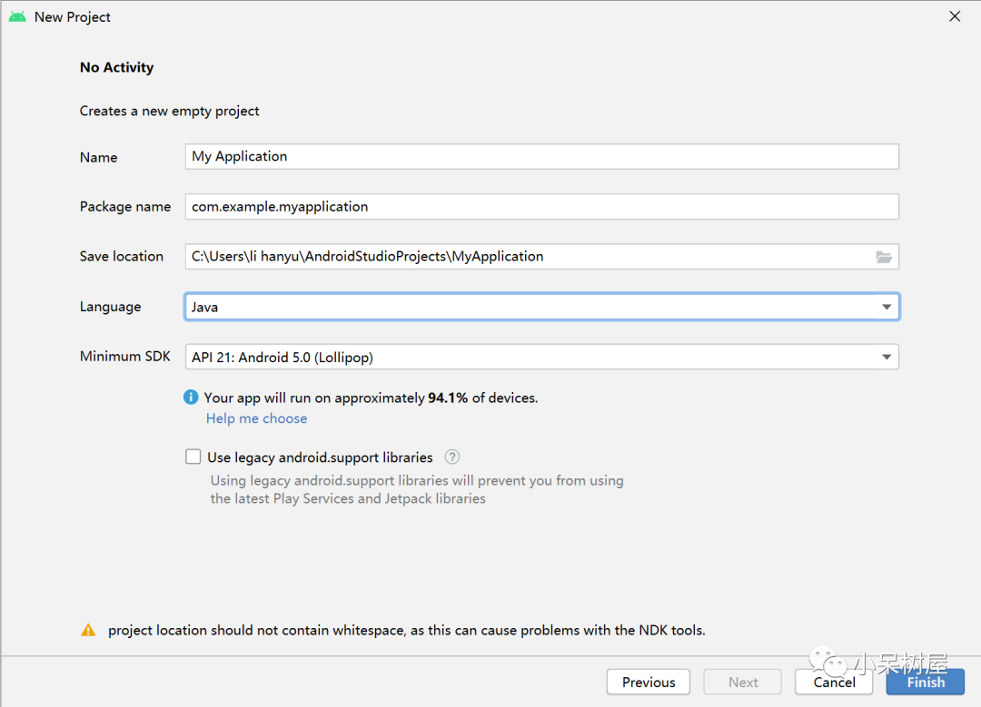 输入项目名称、包名、保存位置,所使用的的编程语言、安卓API版本(限制软件最低Android版本)