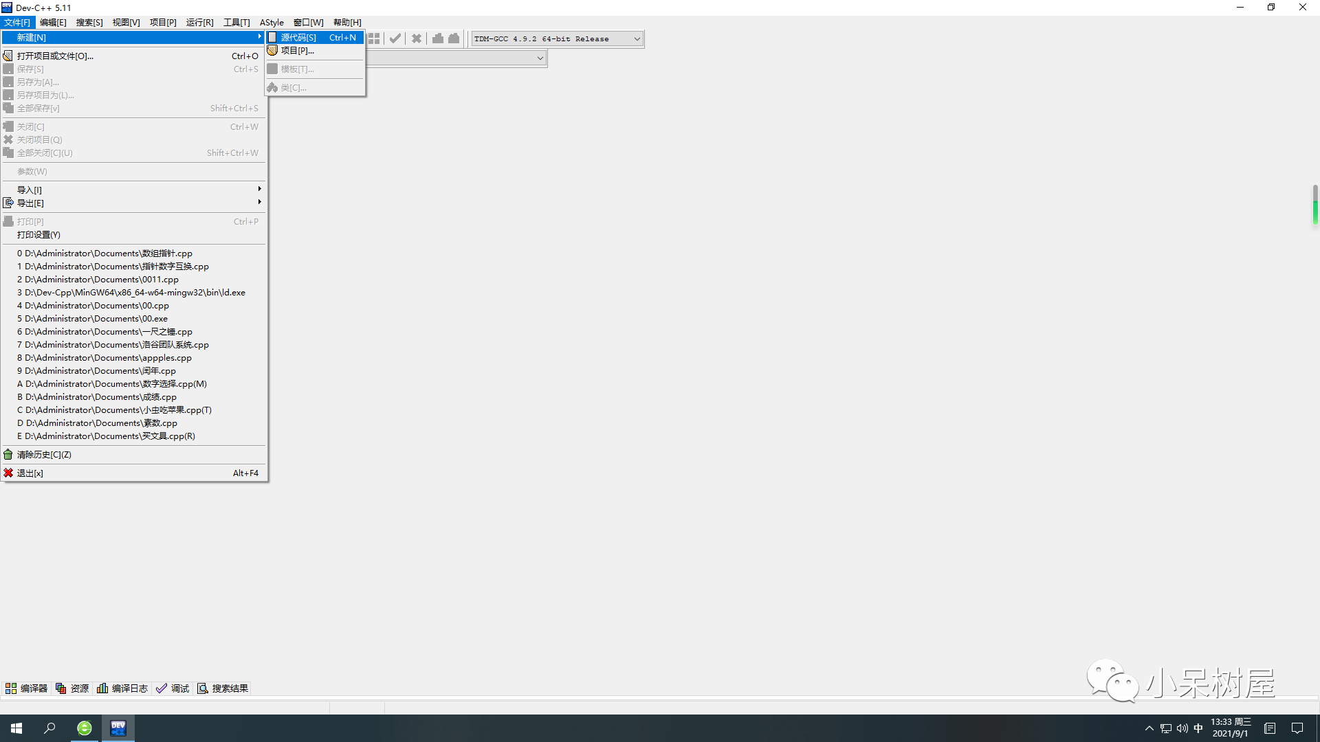 打开DEV C++,点击左上角的文件,然后-新建-源代码。