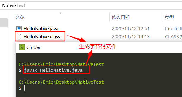 在当前文件夹下使用 CMD 命令行编译 HelloNative.java