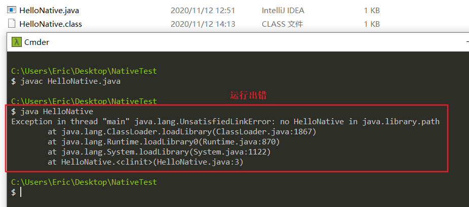 如果当前类中没有 Native 方法,那么我们可以直接使用 java 命令直接运行,但是此时大家直接运行这个代码,会出现以下结果: