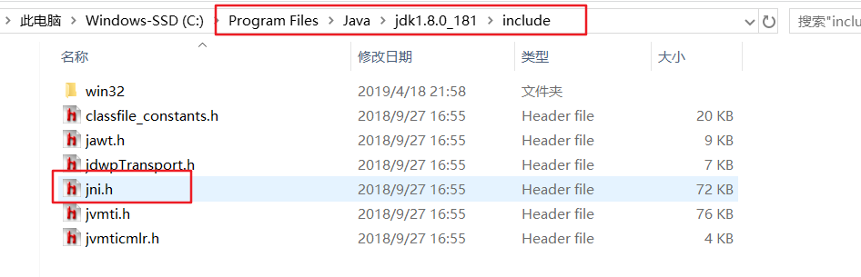 注意:头文件中 jni.h 这个文件,是在本地 JDK 目录下的 include 文件夹中,例如我的目录: