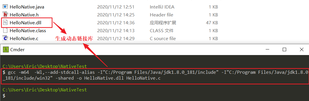 gcc -m64 -Wl,--add-stdcall-alias -I"C:/Program Files/Java/jdk1.8.0_181/include" -I"C:/Program Files/Java/jdk1.8.0_181/include/win32" -shared -o HelloNative.dll HelloNative.c
